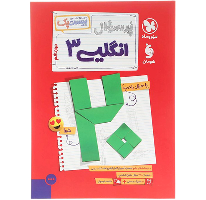 - کامل ترین بانک سوالات امتحانی و نهایی - پوشش کامل مطالب و لغات کتاب درسی دانش اموز و کتاب کار - آموزش ساده و روان گرامر،نگارش،واژگان و درک مطلب - پیش بینی سوالات مفهومی به سبک امتحانات نهایی اخیر - سوالات سطر به سطر و صفحه به صفحه از کتاب درسی دانش آموز و کتاب کار - منطبق با برنامه تدریس دبیران محترم (هر درس در چهار قسمت) - دربرگیرنده قسمت های شنیداری کتاب های دهم،یازدهم،دوازدهم و امتحانات نهایی - ضمینه های کاربردی: واژگان پرتکرار امتحان نهایی + جدول افعال بی قاعده و مکالمات مهم کتاب درسی ویژگی های کاربرگ امتحانی: دوست عزیزم،سلام بسته ای که در دست دارید شامل 3 نوع برگه ی امتحانی است: 1. امتحان های مستمر فصل به فصل 2. امتحان های شبیه ساز نیم سال اول 3. امتحان های شبه ساز نهایی + امتحانهای نهایی اخیر سوالات امتحان های این بسته، براساس آخرین رویکردهای امتحانات نهایی و کاملا مشابه برگه های امتحانی و با رعایت جدیدترین بارم بندی طراحی شده است. بنابراین پیشنهاد میکنیم پس از مطالعه هر فصل از کتاب پرسوال، امتحان همان فصل را جدا کنید و در شرایط مشابه نهایی از خودتان امتحان بگیرید و سپس با توجه به بارم بندی هر سوال در پاسخ نامه، برگه خود را تصحیح و تحلیل کنید. همچنین جهت آمادگی بیشتر شما و کسب موفقیت در امتحانات نوبت اول و نهایی،برگه های امتحانی شبیه ساز در نظر گرفته ایم تا فضای این امتحانات را برای خود شبیه سازی کنید. در نهایت با حل سوالات دو آزمون نهایی اخیر به آمادگی کامل خواهید رسید. شما میتوانید با استفاده از کادرهای آموزشی داخل پاسخ نامه رفع اشکال کنید و از خلاصه کپسولی برای مرور مطالب مهم استفاده نمایید. به امید موفقیت شما در همه امتحانات. ویژگی های خلاصه کپسولی: - خلاصه گرامر کل کتاب - نکات نگارشی امتحانی - واژگان و لغات درس به درس محتویات بسته ۲۰ پک: - کتاب پرسوال - 13 کاربرگ امتحانی - خلاصه کپسولی