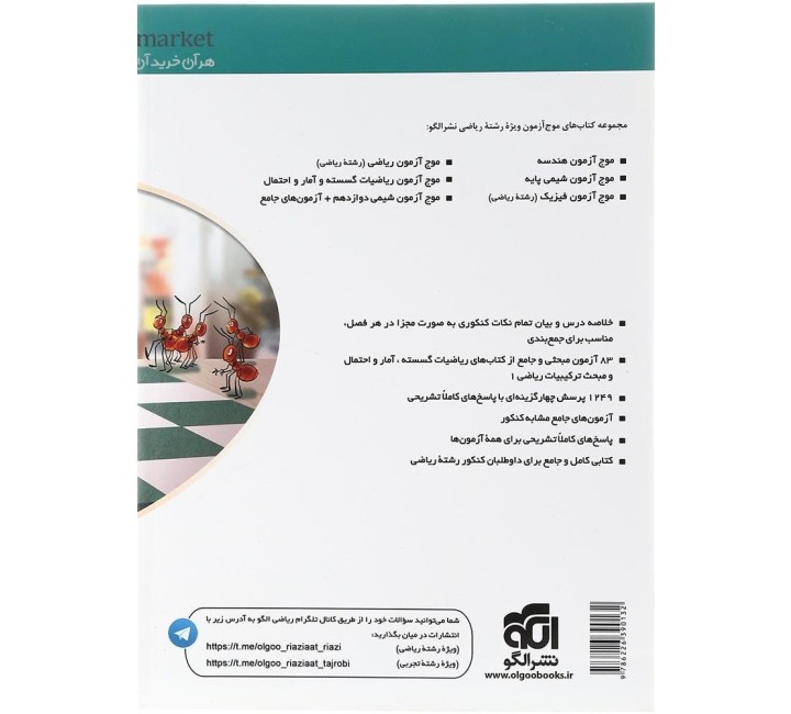 کتاب تک جلدی موج آزمون ریاضیات گسسته و آمار و احتمال کنکور ریاضی انتشارات الگو؛ خلاصه درس و بیان تمام نکات کنکوری به صورت مجزا در هر فصل، مناسب برای جمعبندی ۸۳ آزمون مبحثی و جامع از کتابهای ریاضیات گسسته، آمار و احتمال و مبحث ترکیبیات ریاضی دهم ۱۲۴۹ پرسش چهارگزینهای با پاسخ کاملا تشریحی آزمونهای جامع مشابه کنکور پاسخهای کاملاً تشریحی برای همۀ آزمونها کتابی کامل و جامع برای داوطلبان کنکور رشتۀ ریاضی