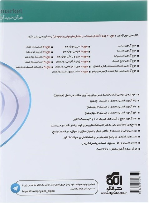 کتاب تک جلدی فیزیک جامع کنکور ریاضی سری موج آزمون انتشارات الگو؛ نمودارهای درختی شامل خلاصه درس برای یادآوری مطالب هر فصل (QR Code) ۳۵ آزمون فصل به فصل از فیزیک دهم ۳۷ آزمون فصل به فصل از فیزیک یازدهم ۵۹ آزمون فصل به فصل از فیزیک دوازدهم ۲۳ آزمون جامع از کتابهای فیزیک دهم، یازدهم و دوازدهم به سبک کنکور پاسخهای کاملاً تشریحی به همراه نیمنگاههایی برای فهم بیشتر نکات در حل تست میانبرهایی برای حل سریعتر تست در پاسخ تشریحی تستهای کنکوری در پاسخ تشریحی برای تسلط کامل بر سوالات کنکور در کل ۱۵۴ آزمون شامل ۲۱۳۱ تست با پاسخ تشریحی